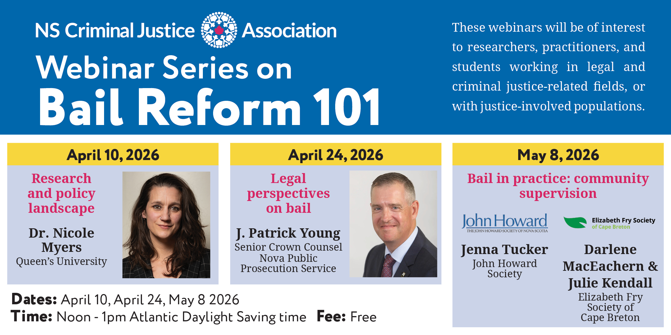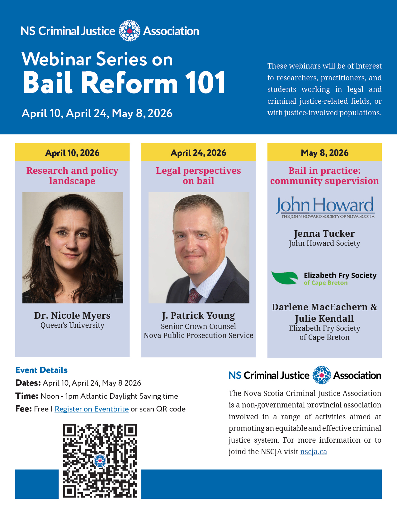 The Nova Scotia Criminal Justice Association (NSCJA) is pleased to invite you to a free, three part webinar series – Bail Reform 101.